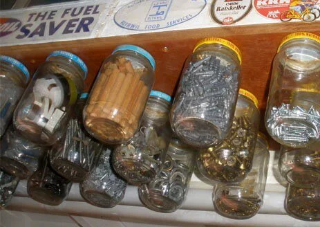 Банки – самый популярный способ хранения мелких вещей, в частности, крепежа. Привинтив крышки к нижней части полки, можно не только сэкономить место, но и получить удобное хранилище с быстрым и удобным доступом. Полка должна находиться на такой высоте, чтобы крышки можно было легко увидеть не сильно наклоняясь.