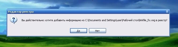 Такая ситуация случается если были переназначены пользователем ассоциации файловых расширений или, как результат работы вируса. Самое простое решение - скачайте файл linkfile_fix.zip. Файл представляет из себя архив файла реестра для исправления ассоциаций ярлыков запуска программ linkfile_fix.reg. Распакуйте его на рабочий стол. Запустите двойным щелчком левой кнопки мыши.